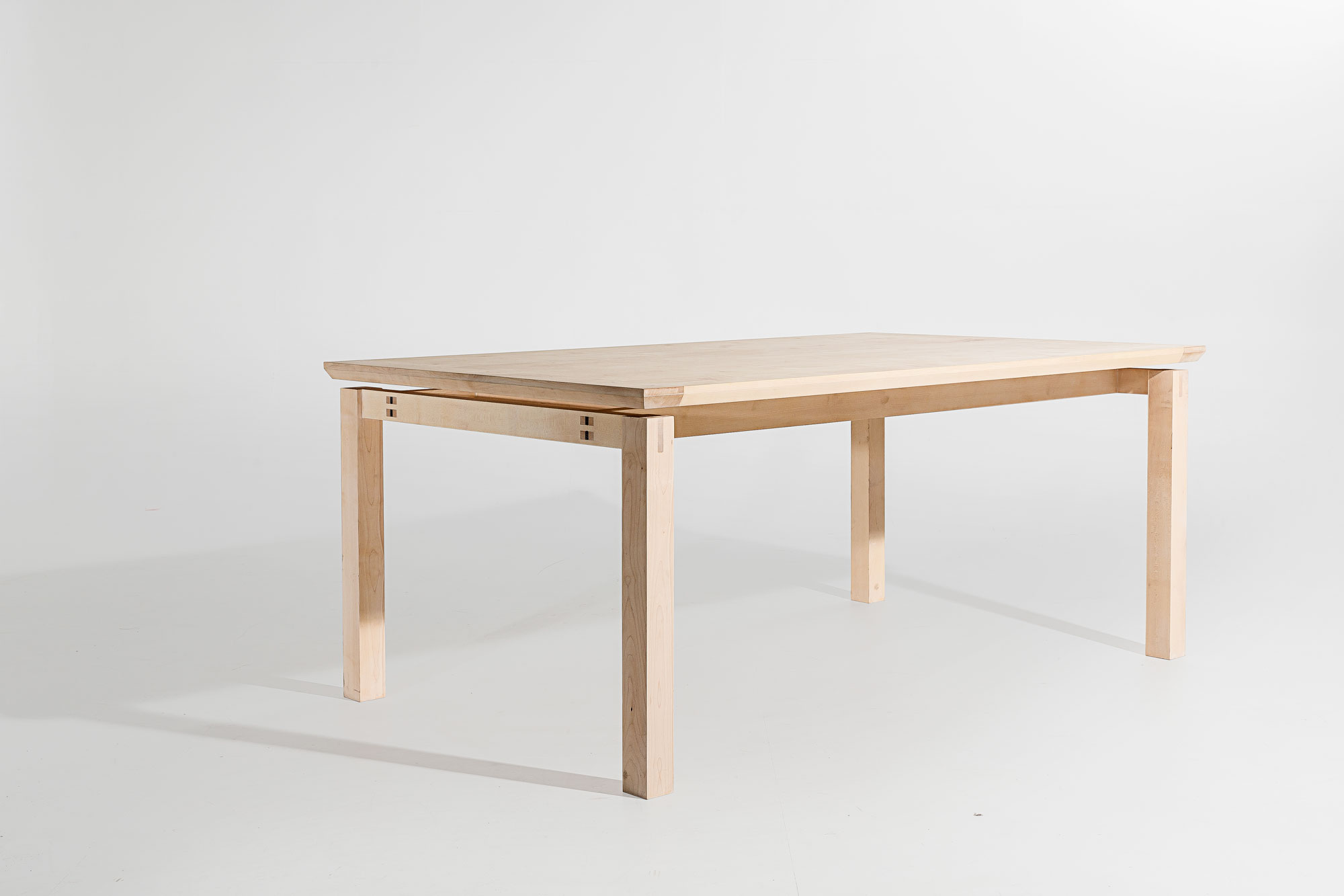 Deze massief houten tafel (esdoorn) met zwevend blad is speciaal gemaakt voor de expositie ‘VORMGEVERS IN HOUT’ bij Fort bij Vechten. Er zijn fraaie ambachtelijke verbindingen in verwerkt. Doorgaande pennen zijn gebruikte om de korte regels aan de poten te bevestigen. De lange regels zijn met opgewigde pennen bevestigd in de korte regels. De wiggen zijn gemaakt van notenhout. De kopregels voor het blad geven het tafelblad de ruimte om te werken en houdt het blad mooi vlak.
